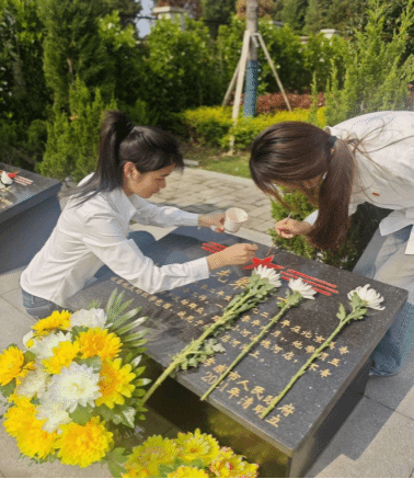 仪式结束后,全体师生依次瞻仰烈士墓,向墓碑敬献鲜花,并开展描金、描红、擦拭墓碑志愿服务,以实际行动寄托哀思。