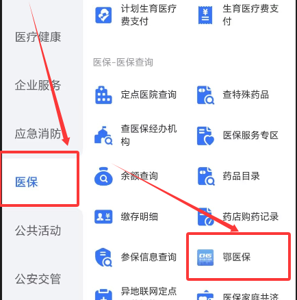 3、点击“医保”——“鄂医保”(注:其他省份的“鄂医保”可能是“医保查询”)